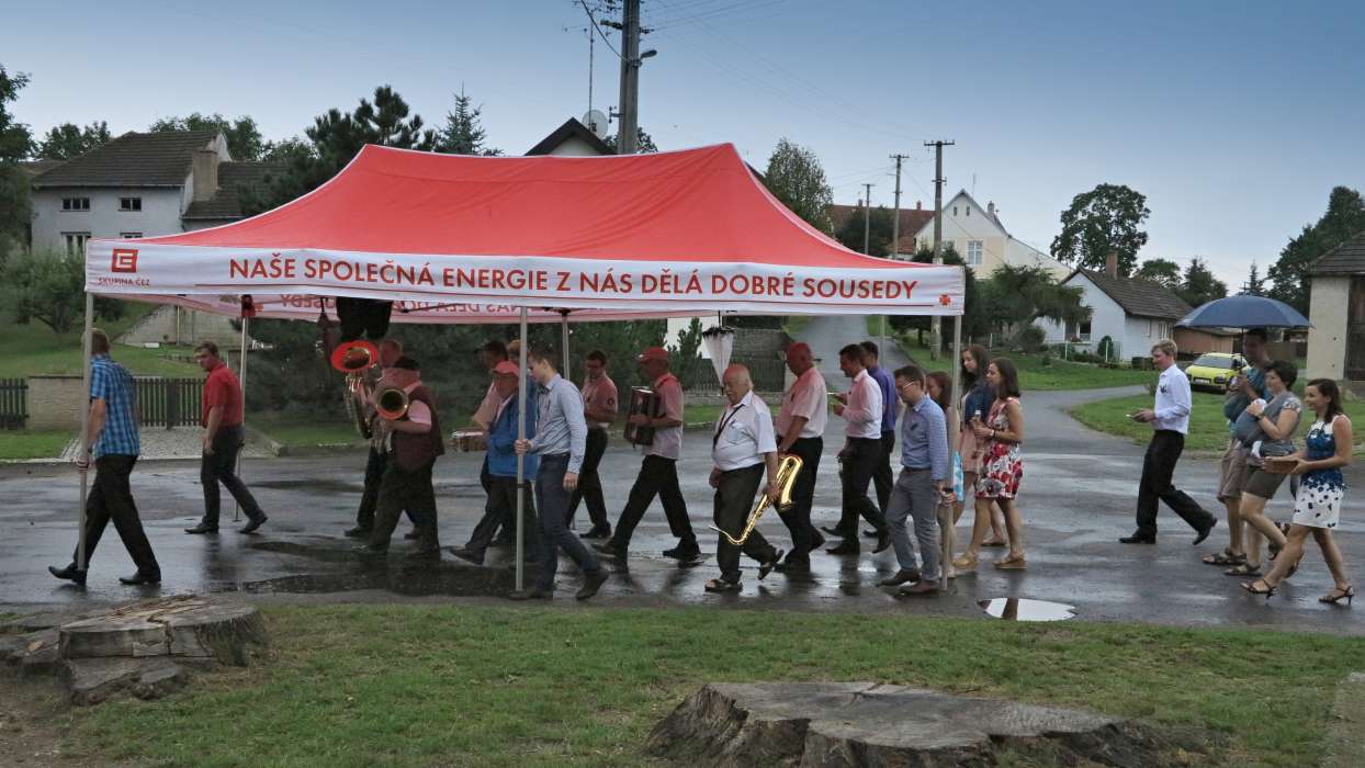 V pátek večer se téměř celá obec sešla u oblíbeného sousedského posezení před kulturním domem s kapelou. V sobotu, jako vždy, proběhlo tradiční sportovní klání: fotbálek ženatí proti svobodným. Oslavy vrcholily v neděli odpoledne průvodem stárků obcí s kapelou. Letos nás nezaskočilo ani deštivé počasí, výborně posloužil stan pořízený s přispěním mikroregionu Horácko a Nadace ČEZ, který putoval po celé obci a vešla se pod něj kapela i doprovázející mládež. Pouťový víkend byl zakončen v kulturním domě kratší taneční zábavou.