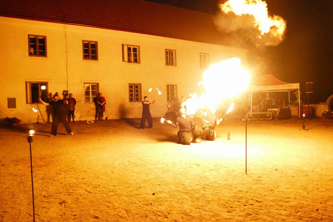 Po setmění se zámek jako vždy rozsvítil, ale v jednadvacet hodin opět zhasl. Světlo by rušilo ohňovou show skupiny historického šermu Albion z Dobšic u Znojma, která sklidila nebývalé ovace všech diváků. A po opětovném rozsvícení slavnostního osvětlení zámku pokračovala zábava. To už tančili i ti dříve narození.